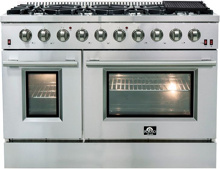 The Forno Galiano 48" Gas Range combines professional-grade performance with sleek stainless steel durability. The cooktop features 8 sealed burners with a total output of 107,000 BTU, including a 20,000 BTU dual-ring burner that can simmer at 1,000 BTU. Our cast iron grates ensure cookware stability and effortless movement between burners. The main convection oven offers 4.32 cu. ft. and delivers a total of 30,000 BTU for broiling and baking, while the secondary oven has a capacity of 2.26 cu. ft. with a 14,00 BTU for baking. Both ovens feature a sleek black enamel interior and a three-layer tempered glass door for superior heat retention and clear visibility. Additional features include 2 oven racks, an LP conversion kit, and durable zinc-coated knobs with bezel rings, built to maintain their beauty.Read More