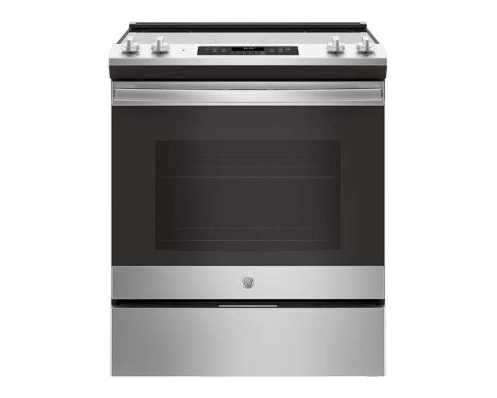 GE® 30" Slide In Electric Range-Stainless Steel with 5.3 cu. ft. total capacity, 4 burners and a black ceramic glass cooktop surfaceRead More
