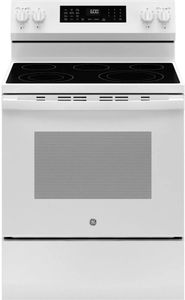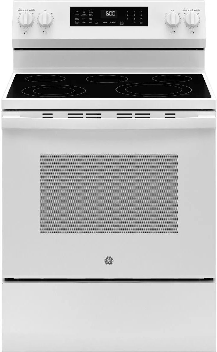 GE® 600 Series 30" White Freestanding Electric Range features EasyWash™ Oven Tray, Built-In WiFi, No Preheat Air Fry, Express Preheat, Fifth Element Warming Zone, Hidden Bake Element, Steam Clean, and Large Capacity Oven.Read More