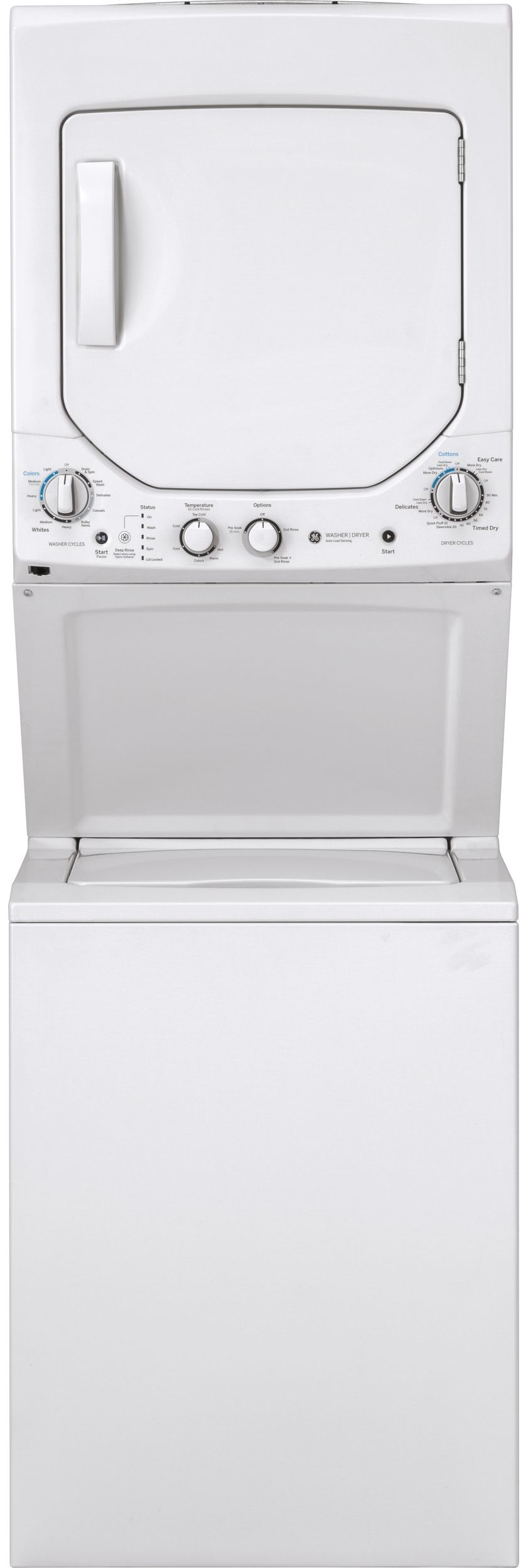GE® Unitized Spacemaker® Stack Laundry-White On White with 2.3 DOE cu. ft washer capacity, 4.4 cu. ft. dryer capacity, 12 wash cycles and electric fuel typeRead More